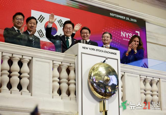 이재명 대통령이 25일(현지시간) 미국 뉴욕 증권거래소에서 개장을 알리는 버튼을 누른 뒤 손을 흔들고 있다. [사진=공동취재단]