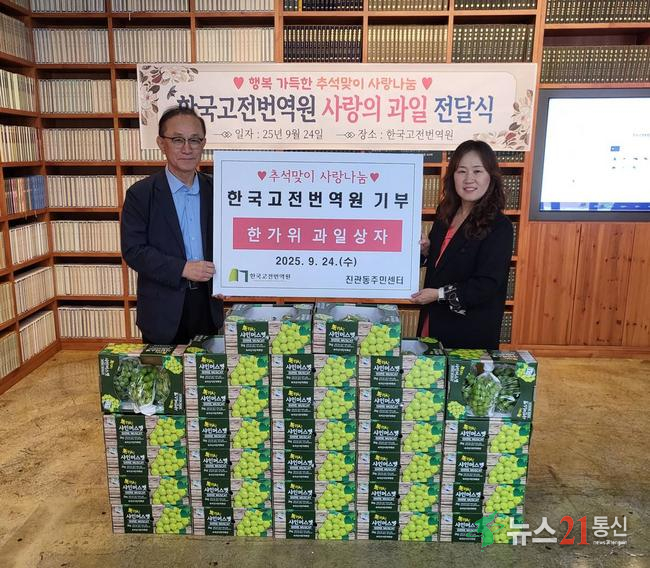 한국고전번역원은 매년 명절마다 진관동 취약가구에 신선한 과일을 후원해 왔으며, 이번 추석에도 홀몸어르신, 저소득 한부모 가정 등 총 30가구에 따뜻한 정을 나눴다. 과일을 받은 주민들은 “올해는 마음까지 풍성한 명절을 보낼 수 있게 됐다”며 고마움을 전했다.