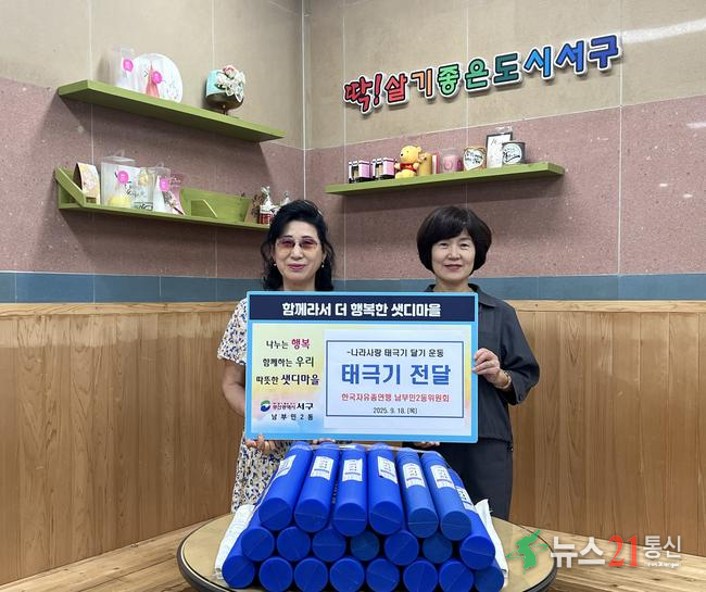 한국자유총연맹 남부민2동위원회(위원장 강순애)는 지난 18일 나라 사랑 태극기 달기 운동 전개를 위해 남부민2동(동장 박혜정)에 태극기를 전달했다.