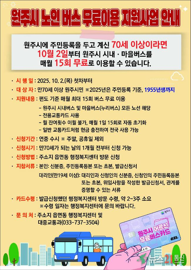 포스터 (사진제공: 원주시청)원주시 어르신 버스 무료이용 지원 대상자는 만 70세 이상 어르신이며, 월 15회까지 관내 모든 시내버스와 누리버스를 무료로 이용할 수 있고, 1회 무료 환승도 가능하다. 무료 횟수를 초과해 이용하고자 하는 경우 가까운 편의점에서 교통카드에 현금을 충전해 사용할 수 있다.