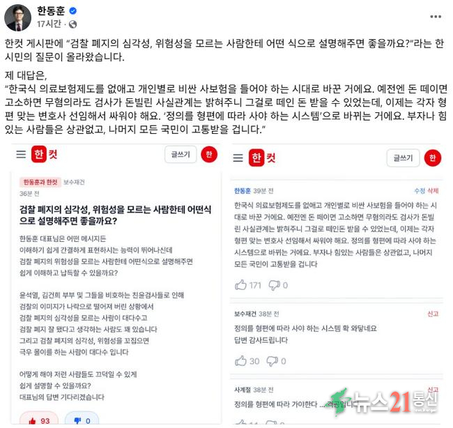 사진=한동훈 전 국민의힘 대표 페이스북 캡쳐다만 해외에서는 이미 검사가 직접 수사를 하지 않고 기소에만 전념하는 제도가 안착해 제도가 작동하는 사례가 적지 않다. 문제는 제도 자체가 아니라 한국 사회에 맞는 견제 장치와 보완책을 충분히 마련했는지 여부다. 한 전 대표의 주장대로 정말 “정의를 돈 주고 사야 하는 사회”가 될 것인지, 아니면 새로운 균형점을 찾을 수 있을지는 앞으로 제도의 설계와 실행에 달려 있다.