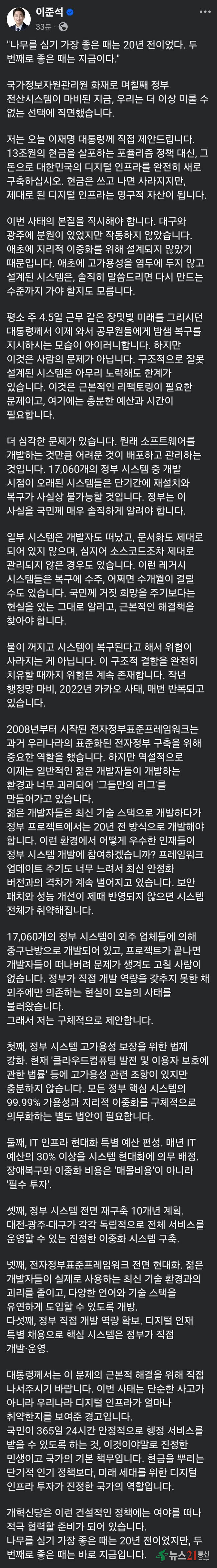 이 대표는 29일 자신의 SNS에 올린 글에서 “나무를 심기 가장 좋은 때는 20년 전이었다. 두 번째로 좋은 때는 지금이다”라는 비유를 들며 “정부 전산시스템이 며칠째 마비된 지금, 우리는 더 이상 미룰 수 없는 선택 앞에 서 있다”고 지적했다. 이어 “현금은 쓰고 나면 사라지지만, 제대로 된 디지털 인프라는 영구적 자산이 된다”며 “포퓰리즘적 현금 살포가 아니라 미래 세대를 위한 디지털 인프라 투자야말로 국가의 기본 책무”라고 강조했다.