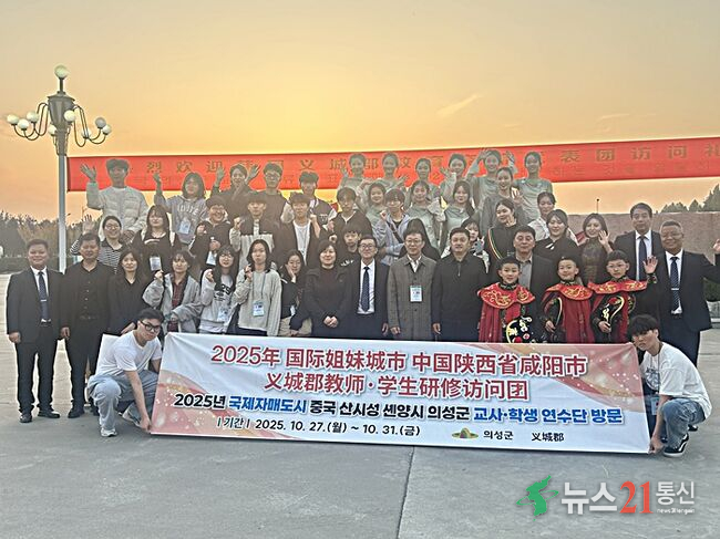 의성군(군수 김주수)은 10월 27일부터 31일까지(4박 5일) 의성교육지원청 전영배 교육지원과장을 단장으로 하는 교류단 25명(중·고등학생 및 인솔자 등)이 국제자매결연 도시인 중국 셴양시(咸陽市)를 방문해 다양한 문화체험 활동을 진행하고 있다고 밝혔다. 셴양시는 중국 최초의 통일국가인 진(秦)나라의 수도였으며, 한(漢)․당(唐) 시.