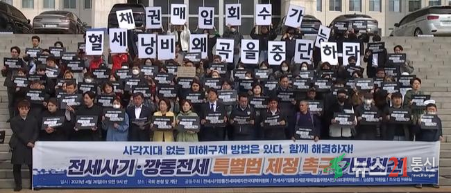 23년 4월 26일 오전 국회의사당 본청 앞 계단에서 전세사기·깡통전세 피해 구제 특별법 제정을 촉구하는 전세사기·깡통전세 피해자 전국대책위원회와 전세사기·깡통전세 문제 해결을 위한 시민사회 대책 위원회의 기자회견이 열렸다. (사진=MBC뉴스영상캡쳐)