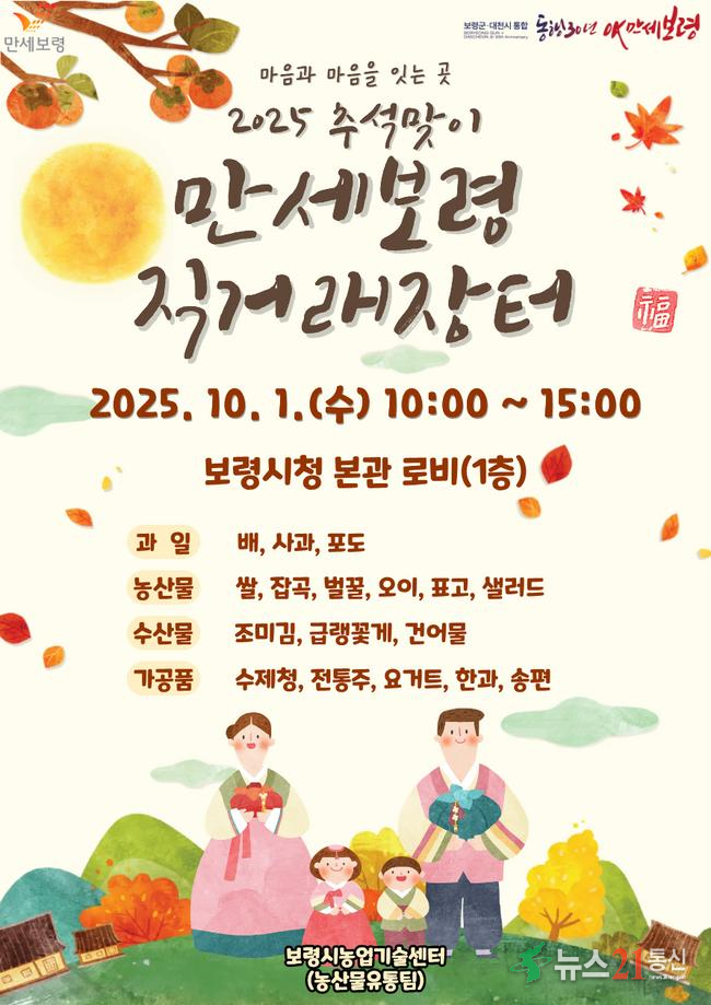 보령시는 추석을 맞아 10월 1일 보령시청 본관 1층 로비에서 ‘2025 추석맞이 만세보령 농특산물 직거래장터’를 운영한다고 밝혔다.