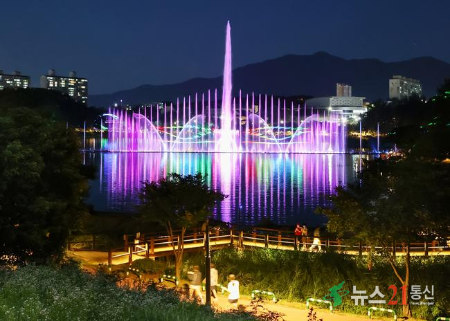 호암지 음악분수는 물과 빛, 음악이 어우러진 환상적인 공연으로 시민들의 일상 속 특별한 휴식처이자 대표적인 야간 명소로 평가받고 있다.