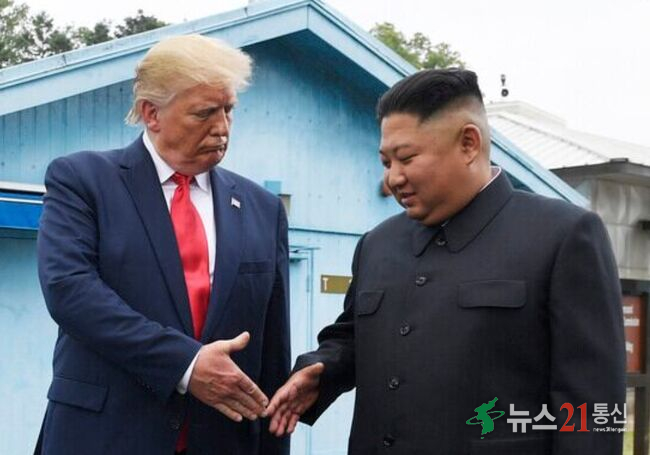 2019년 6월, 김정은 북한 국무위원장과 도널드 트럼프 미국 대통령이 판문점에서 만나 악수를 나누고 있다