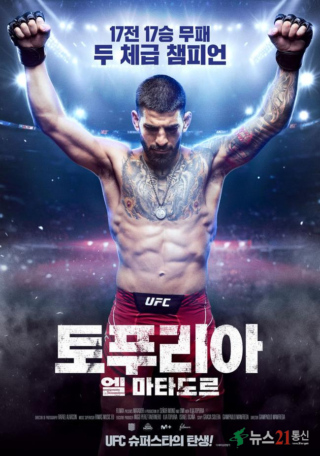 공개된 메인 포스터는 옥타곤 위에서 카리스마를 뿜어내는 토푸리아의 모습과 함께 ‘17전 17승 무패, 두 체급 챔피언’이라는 문구로 팬들의 눈길을 사로잡는다. 함께 공개된 예고편은 “처음 시작했을 땐 UFC에 간다는 건 거의 불가능한 일이었어요”라는 솔직한 고백에서 시작해, 세계 챔피언 타이틀전을 향한 치열한 순간들을 생생히 담아내며 관객의 가슴을 뜨겁게 울린다.