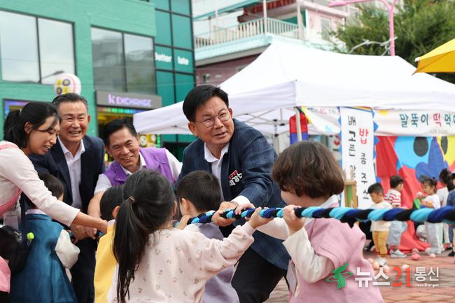 박강수 마포구청장이 어린이들과 함께 줄다리기를 하고 있다.(사진=마포구청)