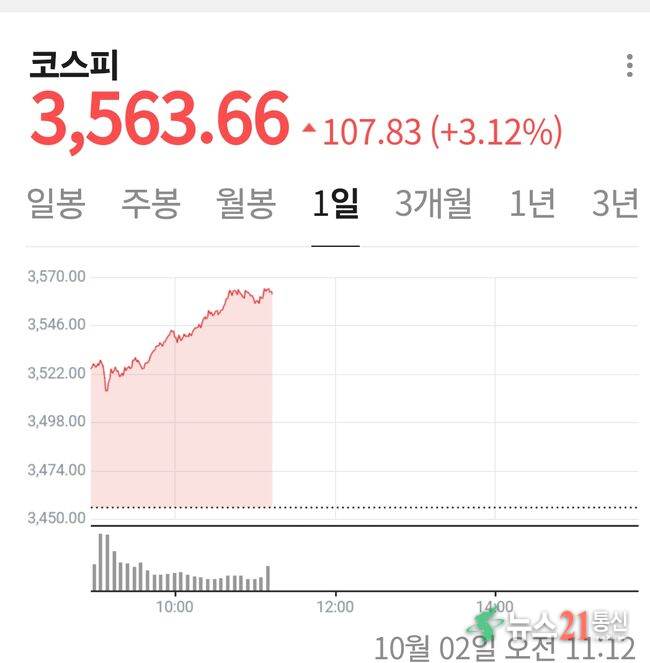 [뉴스21 통신=추현욱 ] 코스피가 3%대 급등세다.