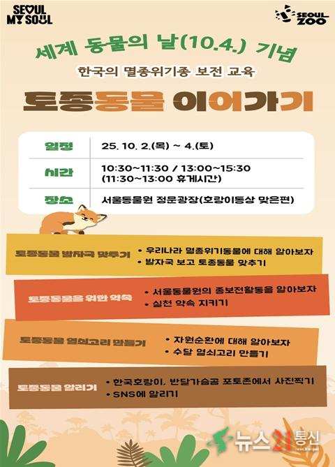 서울대공원(원장 박진순)이 세계동물의 날(10월 4일)을 맞아 멸종위기종 보전교육 프로그램 ‘토종동물 이어가기’를 운영한다. 이번 교육은 시민들에게 토종동물 보호의 필요성을 알리고, 일상 속 실천 의식을 높이기 위해 기획됐다.