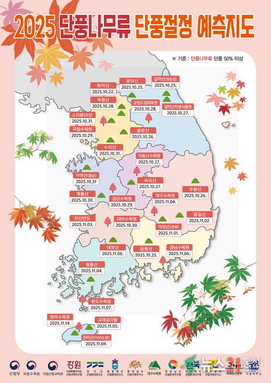 이번 예측은 국립수목원과 전국 9개 공립수목원, 국립산림과학원이 협력해 수집한 장기 관측자료와 산악기상정보를 토대로 산출됐다. 산림청은 단풍 절정을 ‘각 수종의 잎이 50% 이상 물든 시점’으로 규정하고 있다.