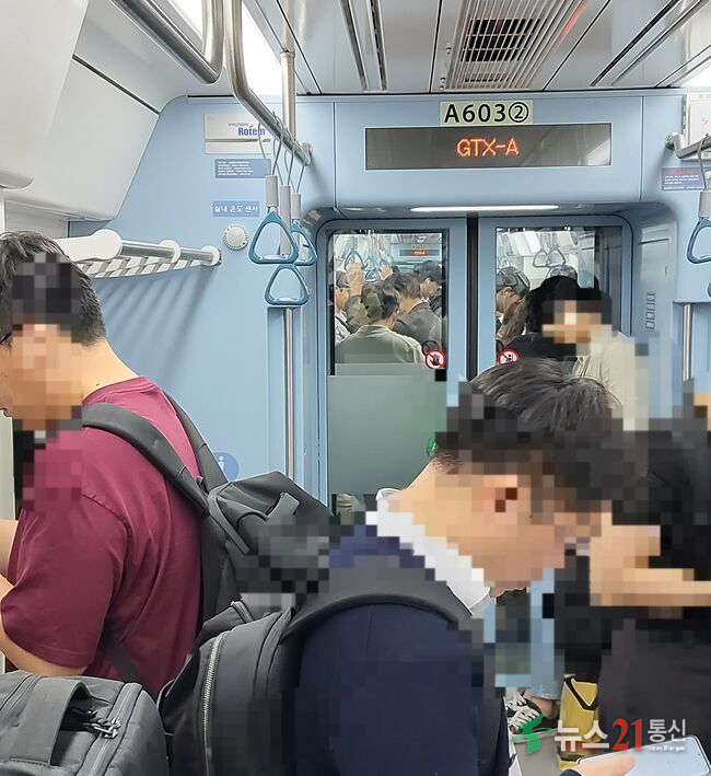 [뉴스21 통신=추현욱 ] 2일 오후 GTX-A 운정중앙역 방면의 객실이 승객으로 붐볐다.
