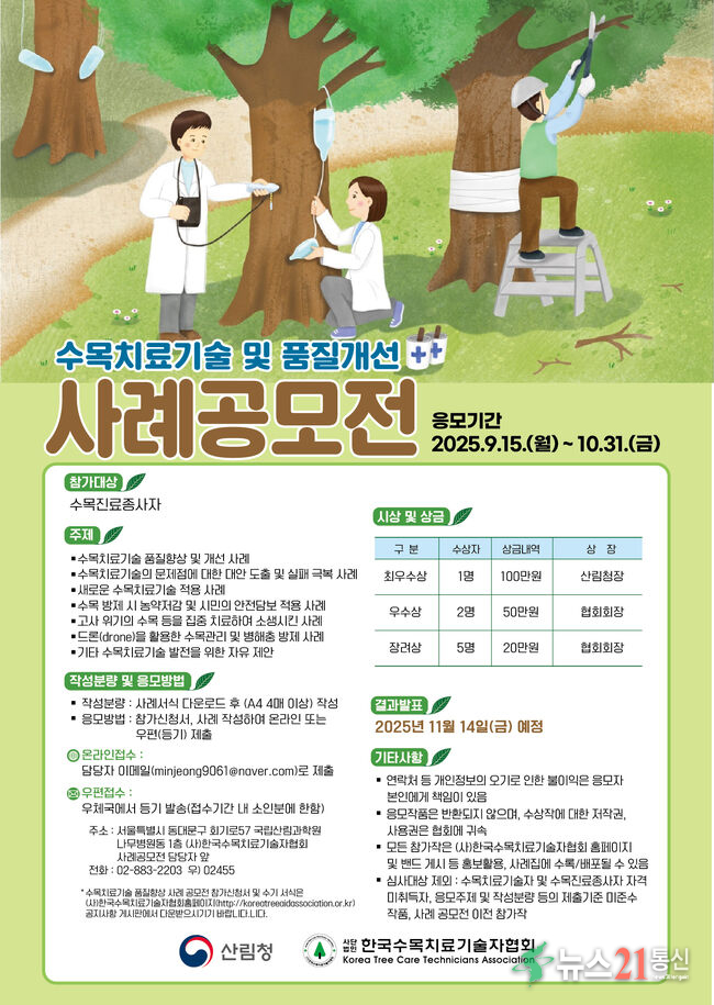 공모 분야는 △수목치료 기술 품질향상 및 개선 사례 △수목치료 기술의 문제점에 대한 대안 도출 및 실패 극복 사례 △새로운 수목치료 기술 적용 사례 △농약 저감 등 안전한 수목치료 사례 △고사 위기 수목 등을 집중해 치료한 사례 등으로 수목치료 기술자 등 종사자라면 누구나 참여할 수 있다.