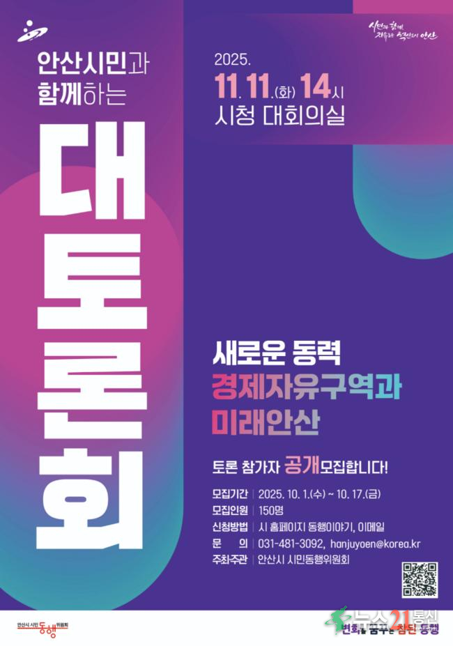 토론회는 안산시민 누구나 참여할 수 있으며, 선착순으로 150명을 모집한다. 참가를 원하는 시민은 오는 17일까지 홍보자료의 QR코드·안산시청 누리집 ‘동행 이야기’·안산시청 ‘새소식’란을 통해 신청서를 내려받아 작성 후 이메일로 제출하면 된다.