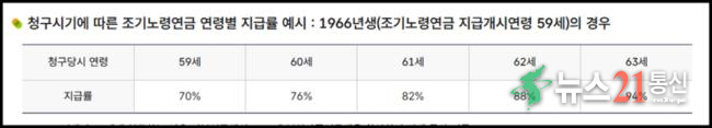 현재, 연금은 반대로 조기수령제도도 있다. 실제 생활에 어려움을 겪는다면, 만 59세부터 수급이 가능한데 대신 지급율은 훨씬 떨어진다.