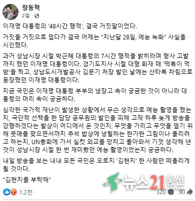 반면 장동혁 대표는 지난 5일 자신의 페이스북에서 “대통령의 48시간 행적은 거짓말이었다”며 “국가적 재난 상황에서 무슨 생각으로 예능 촬영을 했는지 의문”이라고 비난했다. 이에 민주당은 “대통령실이 10월 3일과 4일 두 차례에 걸쳐 소상히 일정을 설명했는데도 허위사실을 퍼뜨렸다”며 명예훼손 혐의를 제기했다.
