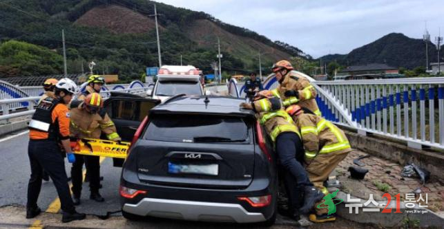 7일 오후 3시47분께 홍천군 화촌면 군업리 군업천 인근 교량에서 A(52)씨가 몰던 니로 승용차가 가드레일을 들이받았다.