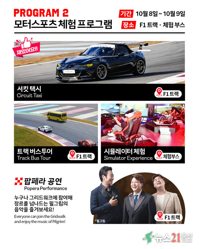 또한, 출발선에 도열한 차량들과 함께하는 ‘그리드워크’ 포토타임과 팝페라 공연이 어우러져 색다른 볼거리를 제공한다.