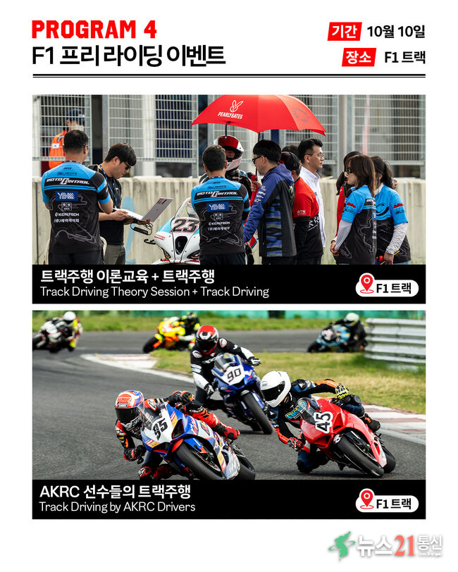 10일에는 일반 바이크 라이더를 대상으로 전문 선수들의 이론 교육과 서킷 주행이 진행된다. 이를 통해 안전한 주행 기술을 습득하고, 건전한 바이크 문화 형성에 기여할 것으로 기대된다.