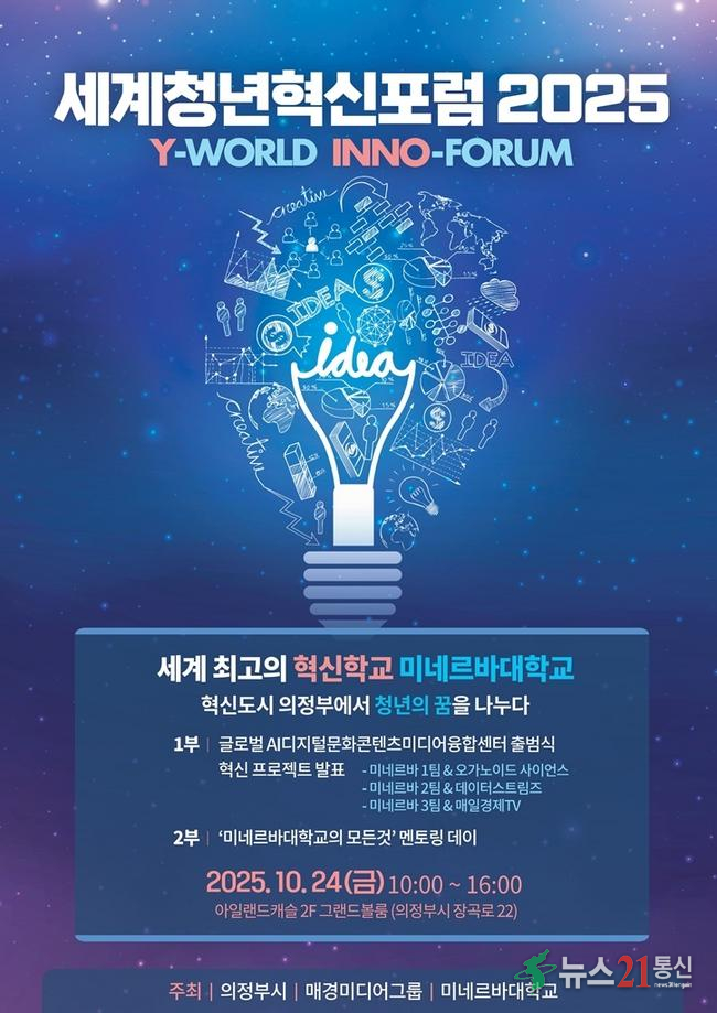 의정부시(시장 김동근)는 10월 24일 오전 10시, 아일랜드캐슬 2층 그랜드볼룸에서 ‘세계청년혁신 공개 토론회(포럼) 2025(Y-WORLD INNO-FORUM)’를 개최한다.