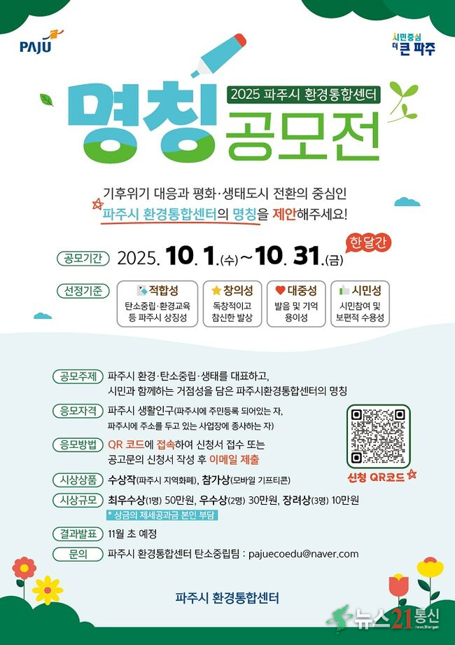 이번 공모전은 시민과 함께하는 탄소중립·환경교육 거점센터로서의 미래상과 정체성을 담은 명칭을 선정하기 위해 마련됐으며, 파주시에 거주하거나 파주시 소재 사업장에서 근무하는 시민이면 누구나 참여할 수 있다.