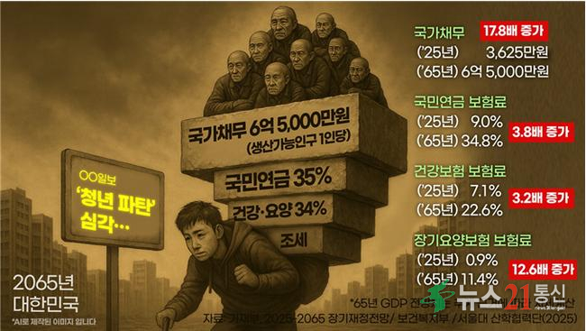 국민의힘 안상훈 국회의원(보건복지위원회)은 14일 열린 보건복지위원회 국정감사에서 “2065년 대한민국은 지금의 재정구조로는 도저히 버틸 수 없다”며 “현 상태를 방치하면 지옥도(디스토피아)가 펼쳐질 것”이라고 경고했다.