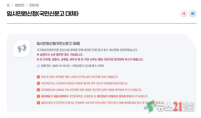 남양주시(시장 주광덕)는 지난 9월 26일 국가정보자원관리원 화재로 국민신문고 시스템이 중단된 가운데, 시민 불편을 줄이기 위해 시 홈페이지에 임시 민원 접수 창구를 마련해 10월 15일부터 운영하고 있다고 밝혔다.