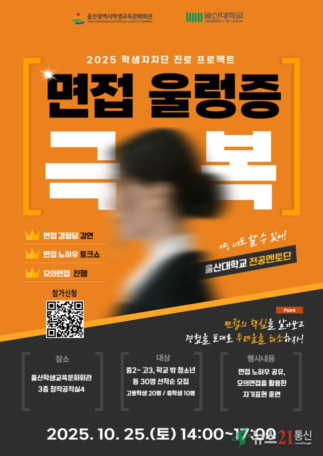 울산학생교육문화회관(관장 김현미)은 오는 25일 본관 학생자치실에서 중2~고3, 학교 밖 청소년 등 30명을 대상으로 ‘면접 울렁증 극복 프로그램’을 진행한다.
