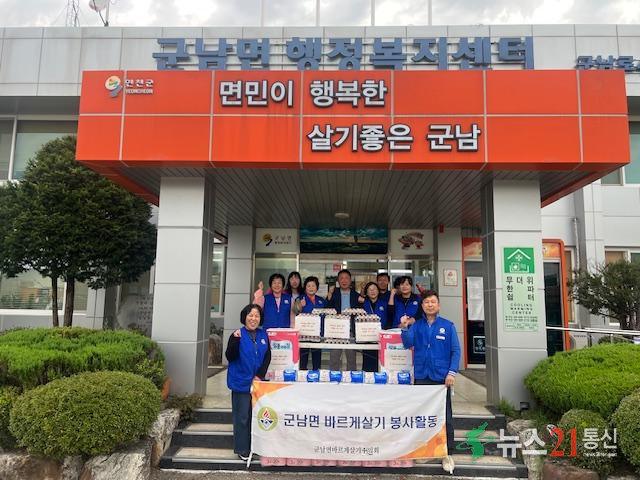 군남면 바르게살기운동협의회는 매년 관내 취약계층을 위해 생필품 키트 등 후원물품을 기탁하고 있으며, 지역의 어려운 이웃을 위해 솔선수범하여 따뜻한 도움의 손길을 보내고 있다.