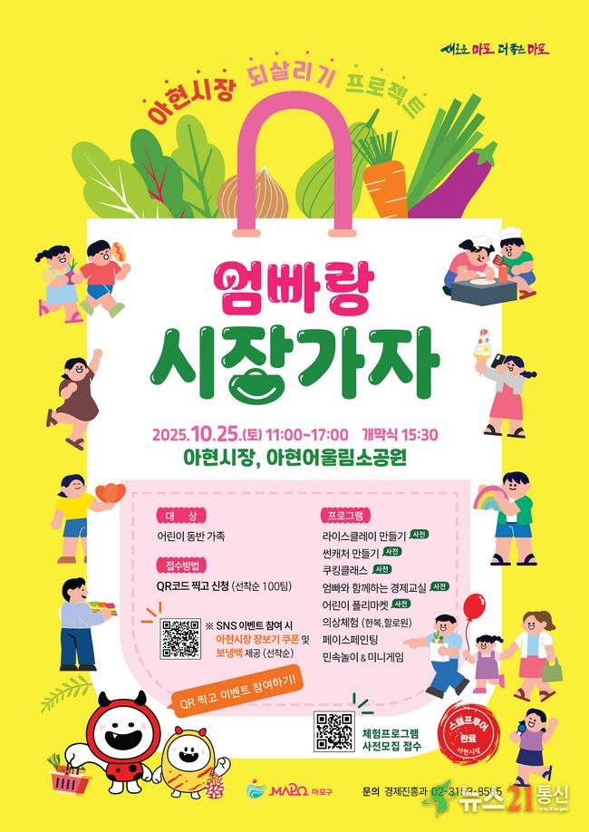 마포구(구청장 박강수)는 10월 23일까지 ‘장바구니 속, 추억 한바구니 엄빠랑 시장가자’ 프로그램에 참여할 어린이 동반 가족 100팀을 선착순으로 모집한다.