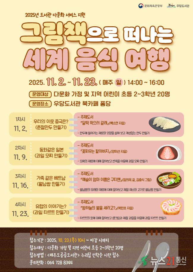 우당도서관이 2025년 도서관 다문화 서비스 지원사업의 일환으로 마련한 ‘그림책으로 떠나는 세계 음식 여행’ 프로그램 참여자를 10월 23일부터 선착순 모집한다.