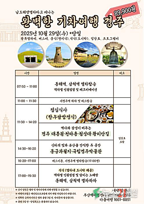 ‘완벽한 기차여행 경주’ 상품과 관련한 자세한 내용과 상품 예약은 부산역 여행센터(☎051-440-2513) 및 관련 여행사 ㈜다올여행(☎1661-8851) 또는 네이버 스마트스토어를 통해 확인할 수 있다.