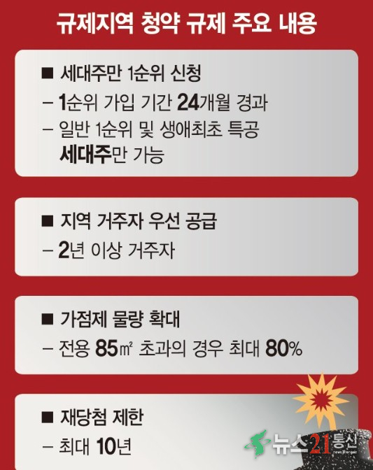 세부적으로 보면 우선 규제지역으로 지정되면 일반 1순위 신청시 세대주만 가능하다. 비규제지역에서는 세대주와 세대원 모두 1순위 신청이 가능했는데 규제지역은 세대주만 1순위 자격이 주어지는 것이다.