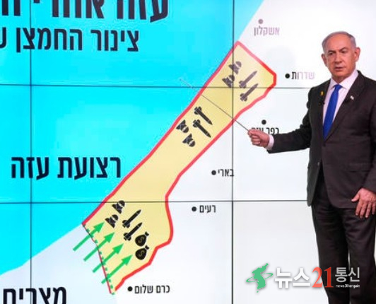 베냐민 네타냐후 이스라엘 총리가 9월2일 예루살렘에서 기자회견 중 가자지구 지도를 가리키며 2005년 이스라엘군이 철수한 후 하마스가 어떻게 이 지역에 무기를 들여왔는지 설명하고 있다 (사진= 네이버db 갈무리)