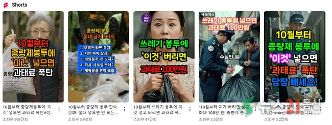 최근 다수의 유튜브 채널에는 “전국적으로 단속이 강화돼 과태료 폭탄 사례가 속출하고 있다”는 내용의 영상이 잇따라 게재됐다. 일부 영상은 인공지능(AI)으로 생성된 가상의 인물을 등장시켜 “구청 환경과에서 25년간 근무했다”는 설정 아래 ▲라면·과자봉지를 종량제봉투에 버려 20만원 ▲두부 용기 세척 미흡으로 9만원 ▲볼펜을 버려 80만원의 과태료를 부과받았다는 허위사례를 제시했다.