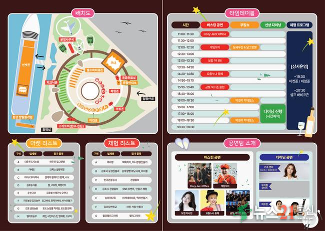 현장에서는 제철 수산물과 지역 농축산물을 활용한 다양한 로컬푸드가 선보이며, 관람객은 한우·한돈 등 식재료를 직접 구매해 구워 먹을 수 있는 셀프 바비큐존을 이용할 수 있다. 주최 측은 화로와 조리도구, 테이블 등을 무료로 제공하며, 현장에서는 경품 이벤트와 칵테일쇼, 버스킹 공연 등 부대 프로그램도 진행된다.