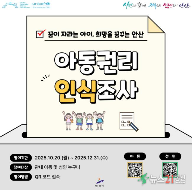 안산시(시장 이민근)는 오는 12월 31일까지 ‘2025년 안산시 아동권리 인식조사’를 실시한다고 20일 밝혔다.