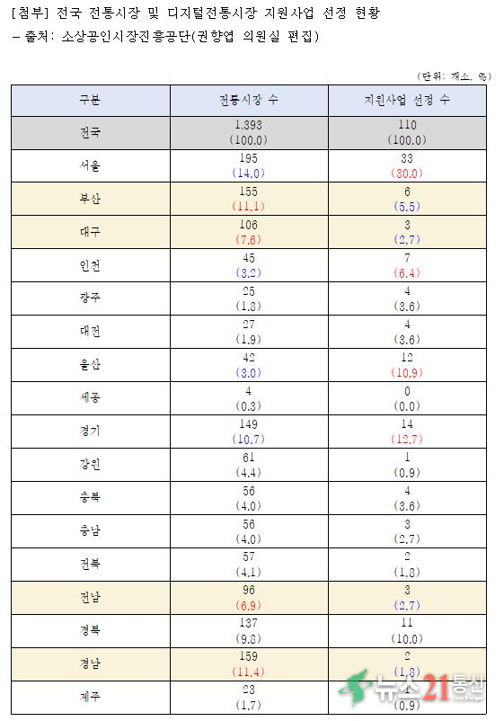 반면, 지방은 전통시장 수에 비해 지원 비율이 현저히 낮았다. 전국 전통시장은 총 1,393개소로, 서울(195개소·14.0%), 경남(159개소·11.4%), 부산(155개소·11.1%) 순으로 많지만, 지원사업에서는 서울 30%(33개소), 경남 1.8%(2개소), 부산 5.5%(6개소)로 격차가 컸다.