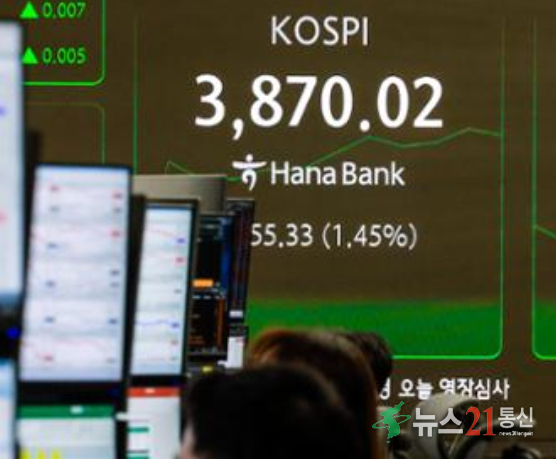 21일 서울 중구 하나은행 딜링룸 현황판에 코스피가 3,870.02를 나타내고 있다.