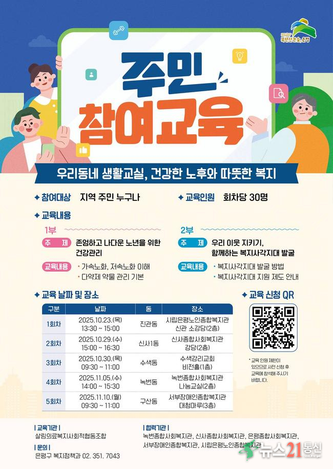 교육은 10월 23일 시립은평노인종합복지관을 시작으로, 29일 신사종합사회복지관, 30일 수색감리교회, 11월 5일 녹번종합사회복지관, 11월 10일 서부장애인종합복지관에서 진행된다.