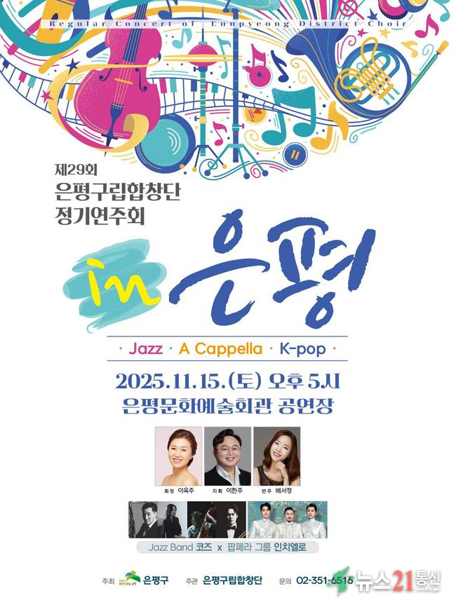 공연에는 은평구립합창단을 비롯해 재즈 밴드 ‘코즈’, 팝페라 그룹 ‘인치엘로’가 함께 참여해 재즈, 아카펠라, 케이팝(K-POP) 등 다양한 장르의 음악을 선보일 예정이다. 약 1시간 30분 동안 이어질 이번 무대는 관객과 함께 호흡하는 풍성한 공연으로 꾸며진다.
