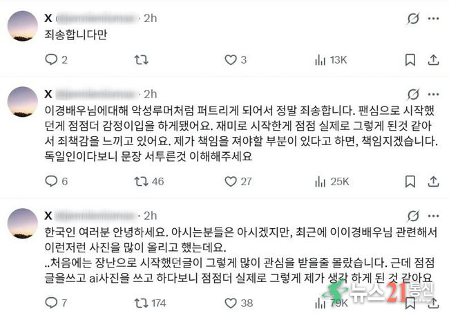 A씨는 22일 새벽 엑스(X·옛 트위터)에 “한국인 여러분 안녕하세요. 최근에 이이경 배우님 관련 사진과 글을 올렸던 사람”이라며 “처음에는 장난으로 시작했지만, 생각보다 반응이 커져 감정이입을 하게 됐다. 죄송하다”고 적었다. 그는 “AI 사진을 이용했고, 실제 사실이 아닌 내용을 퍼뜨렸다”며 “이이경 배우님께 피해를 끼쳐 죄책감을 느낀다. 책임질 부분이 있다면 감수하겠다”고 덧붙였다.