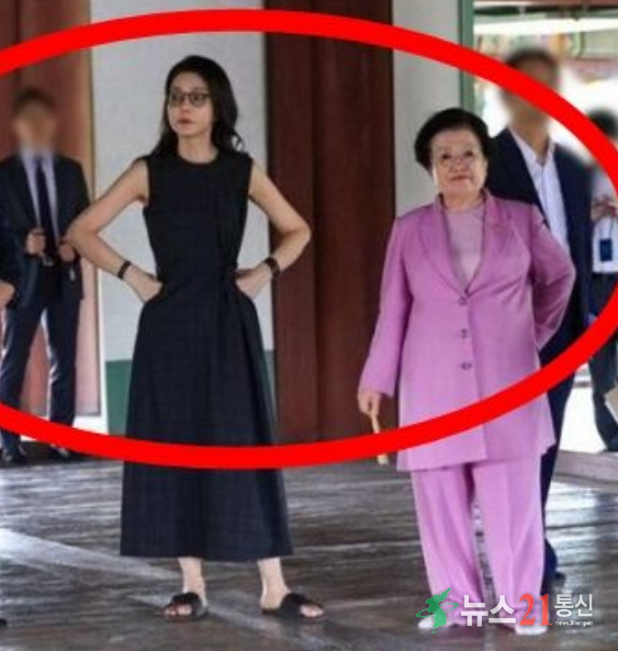 사진에는 김 씨가 맨발에 슬리퍼를 신고 허리춤에 손을 올리고 있으며 그 옆에는 이 전 위원장이 서 있는 모습이 담겼다.
