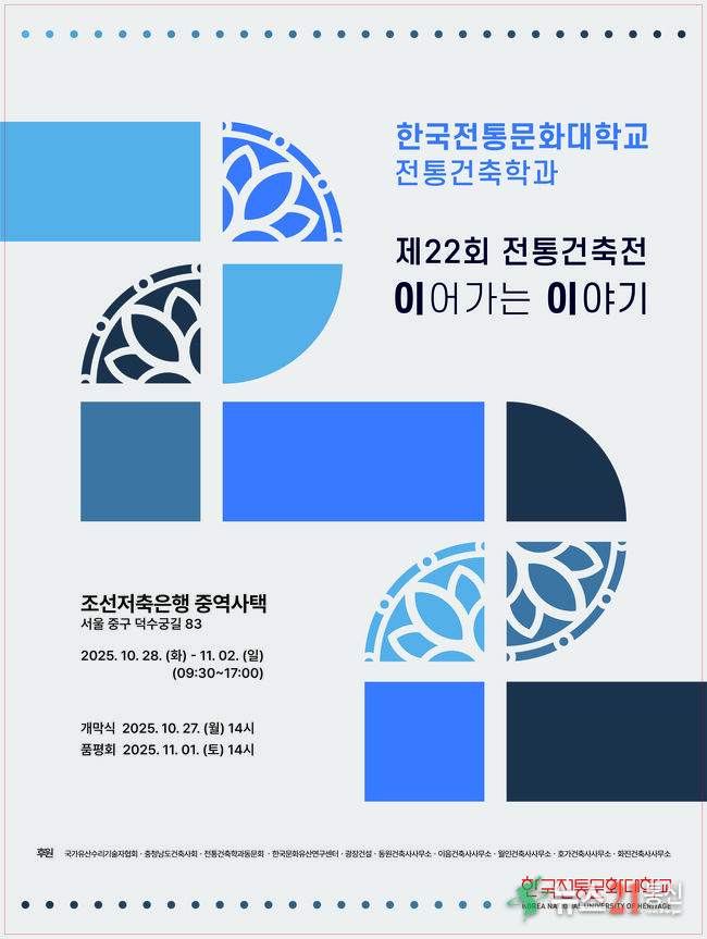 국가유산청 한국전통문화대학교(총장 강경환)는 오는 10월 28일부터 11월 2일까지 서울 중구 덕수궁 선원전 영역 내 구(舊) 조선저축은행 중역사택에서 「제22회 전통건축전」을 개최한다. 개막 행사는 10월 27일 오후 2시 같은 장소 1층에서 열린다.올해 전시는 ‘이어가는 이야기’를 주제로, 전통과 근대를 아우르는 건축유산의 가치와 ...
