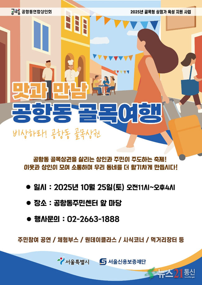 또, 공항동 연합 골목형상점가(공항동 55-38, 41-105, 301-56일대)에서는 ‘맛과 만남, 공항동 골목 여행 축제’가 오는 25일(토) 오전 11시부터 오후 4시까지 열린다.