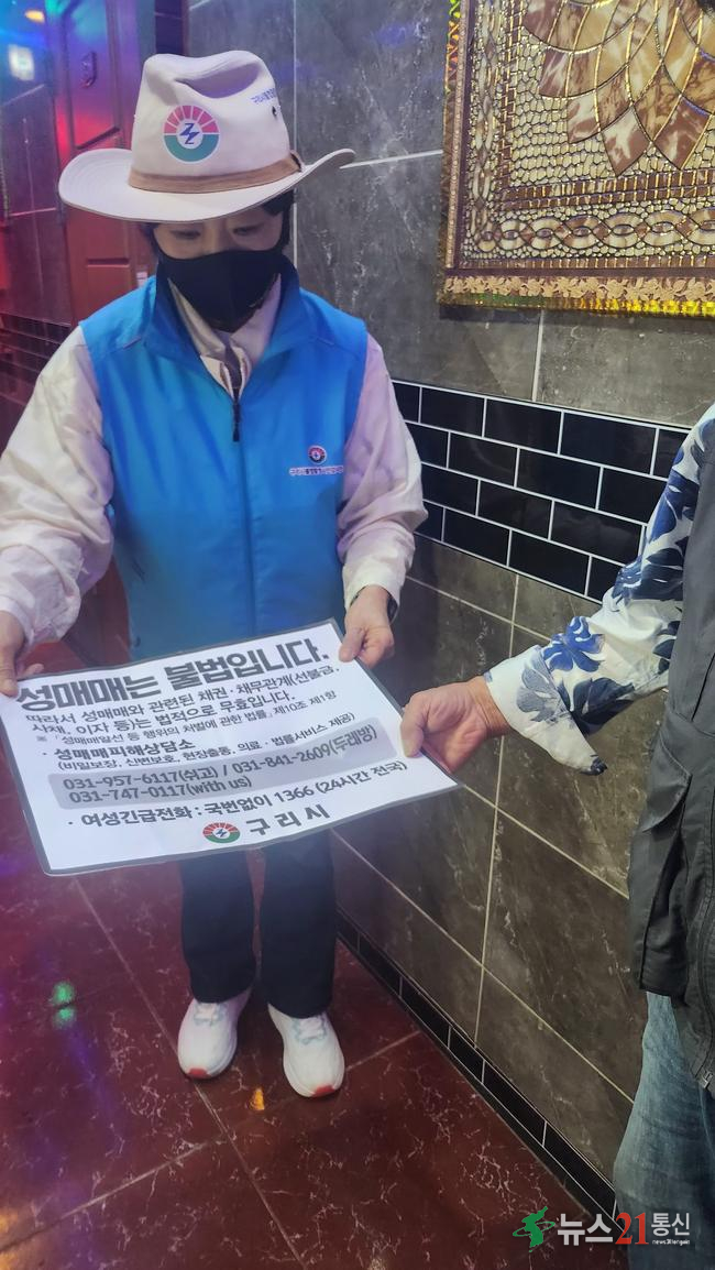 사진=구리시 제공이날 점검단 35명은 11개 조로 편성되어, 성매매가 우려되는 유흥업소 등을 방문해 ▲성매매 방지 게시물 부착 여부 ▲불법 성매매 광고물 게시 여부 등을 집중적으로 점검했다. 또한 성매매 방지 게시물의 크기·위치·내용을 세부 확인하고, 필요시 새롭게 제작된 성매매 방지 안내문을 추가로 배부하여 업소 내 잘 보이는 곳에 부착하도록 안내했다.