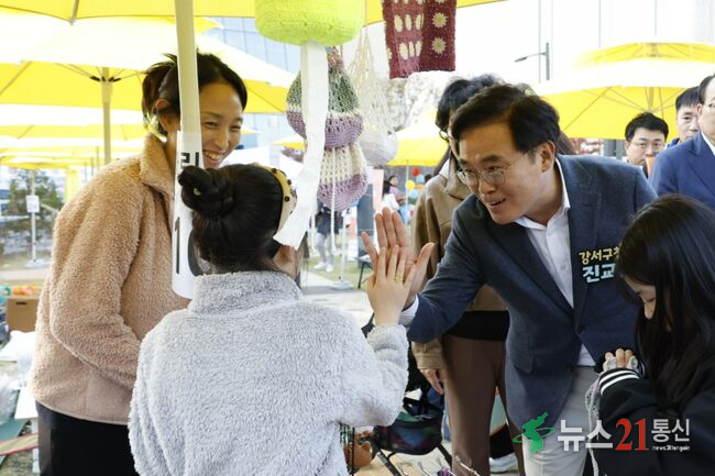 사진=강서구, 진교훈 구청장(오른쪽)이 25일(토) 발산근린공원에서 열린 ‘발산마을축제’에서 플리마켓에 참여한 아이와 손을 맞대고 있다.