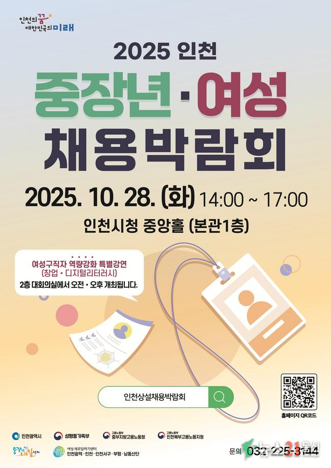 인천광역시는 중장년층과 여성의 새로운 일자리 도전과 사회 참여 확대를 지원하기 위해 오는 10월 28일 인천시청 중앙홀에서 ‘2025 인천 중장년·여성 채용박람회’를 개최한다고 밝혔다.