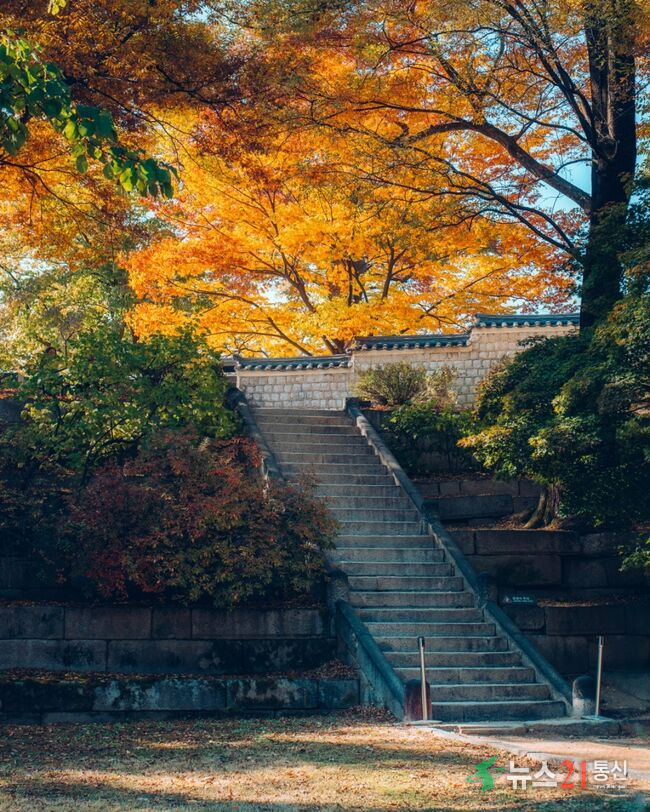 계단 끝부분에 노랗게 물든 단풍나무가 사람의 시선이 계단 선을 따라 자연스럽게 단풍나무로 향하도록 유도한다.